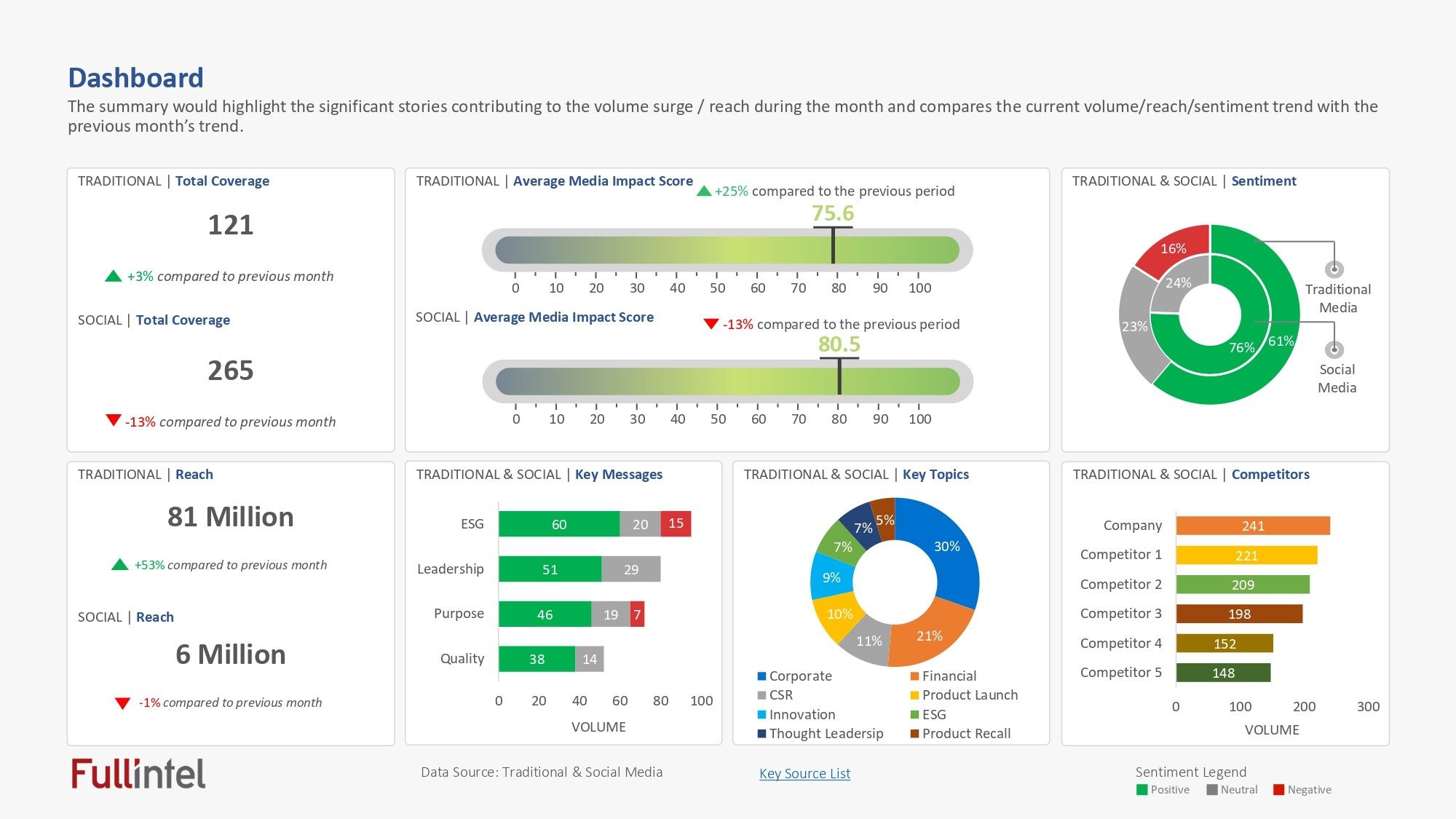 - Media Impact Score (MIS): Fullintel’s proprietary Media Impact Score is based on AMEC best practices and measures both the quality and frequency of coverage by weighting metrics such as reach, sentiment, prominence, key messages, and other factors. It provides a quickly understandable score out of 100 for each media item and can be used to evaluate entire campaigns, topics, or time periods.
