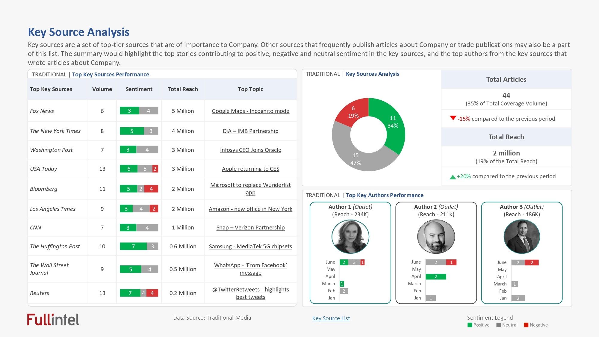 - Reach and syndication data: Including the overall circulation/reach generated across both traditional and social media, along with a breakdown of original articles vs. syndications.