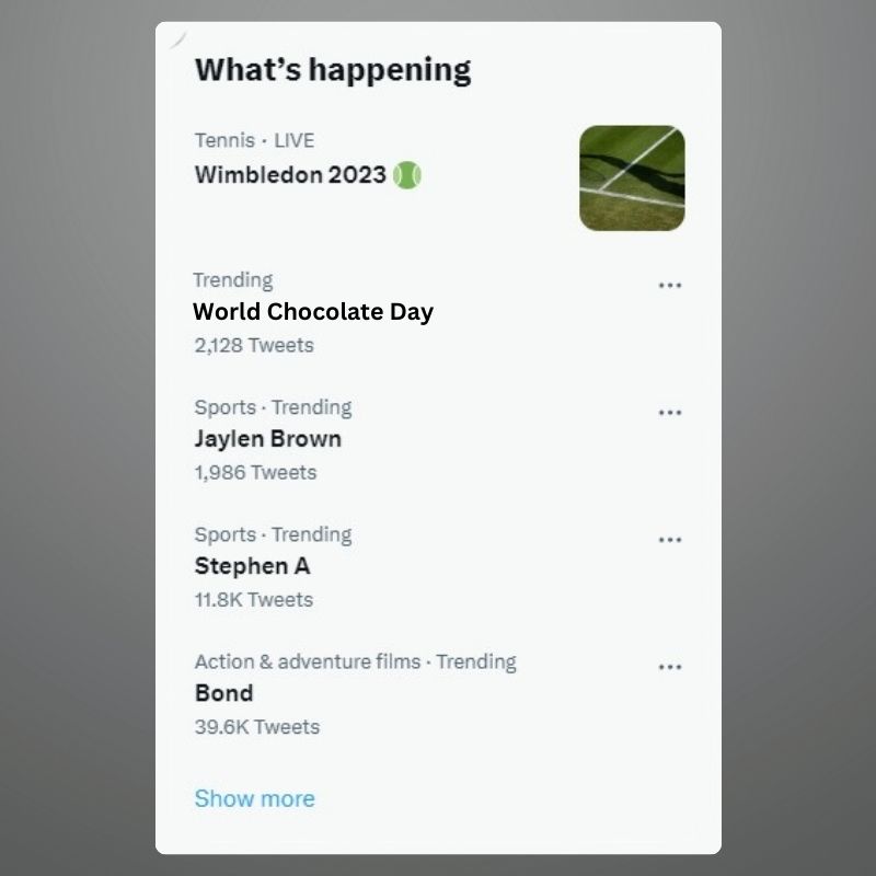 5. What’s Happening Tab Missing: This often maligned feature of Twitter is useful for “What’s happening right now” questions. How else will I know that it is World Chocolate Day?