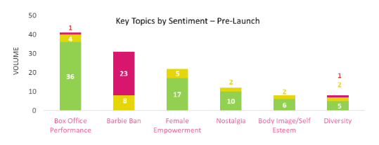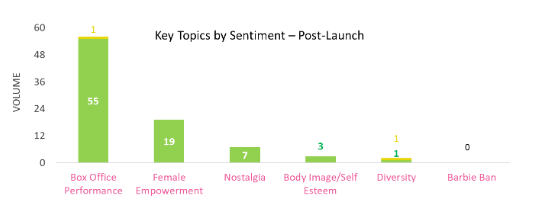 In Barbie’s enchanting world, the themes of body image, self-esteem, and diversity subtly yet profoundly shape the narrative. As the dust settles post-release, it’s evident that discussions surrounding these aspects are mostly positive with mixed sentiment comprising only a fraction of the overall coverage (only 2% of topic coverage was mixed post release).