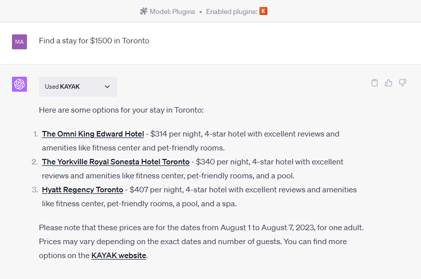 2. KAYAK: Explore flights, accommodations, and car rentals – or receive suggestions for destinations that fit within your budget with the GPT version of the popular travel app.