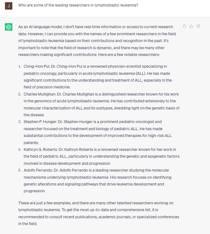 ChatGPT might actually benefit students in this manner, asking prompts like “Who are the leading researchers in lymphoblastic leukemia?” This kind of educated prompting can generate detailed responses that provide breadcrumbs on influencers or experts who should be listened to.