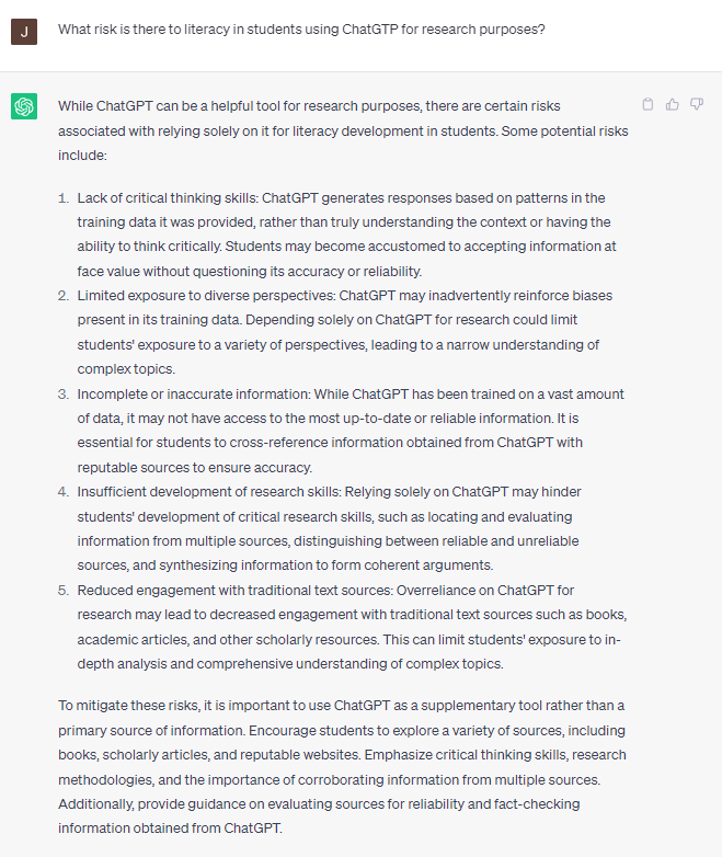 1. Research Fundamentals: How to find information, where to find it, and how to source it. We do a little bit of this in high school – or at least we used to in Canada. Doing more of this, and doing it with data as opposed to sourcing tidbits of text for an essay, is required. If students learn these processes well, they’ll be able to better decipher what and how a generative AI would come up with its responses.