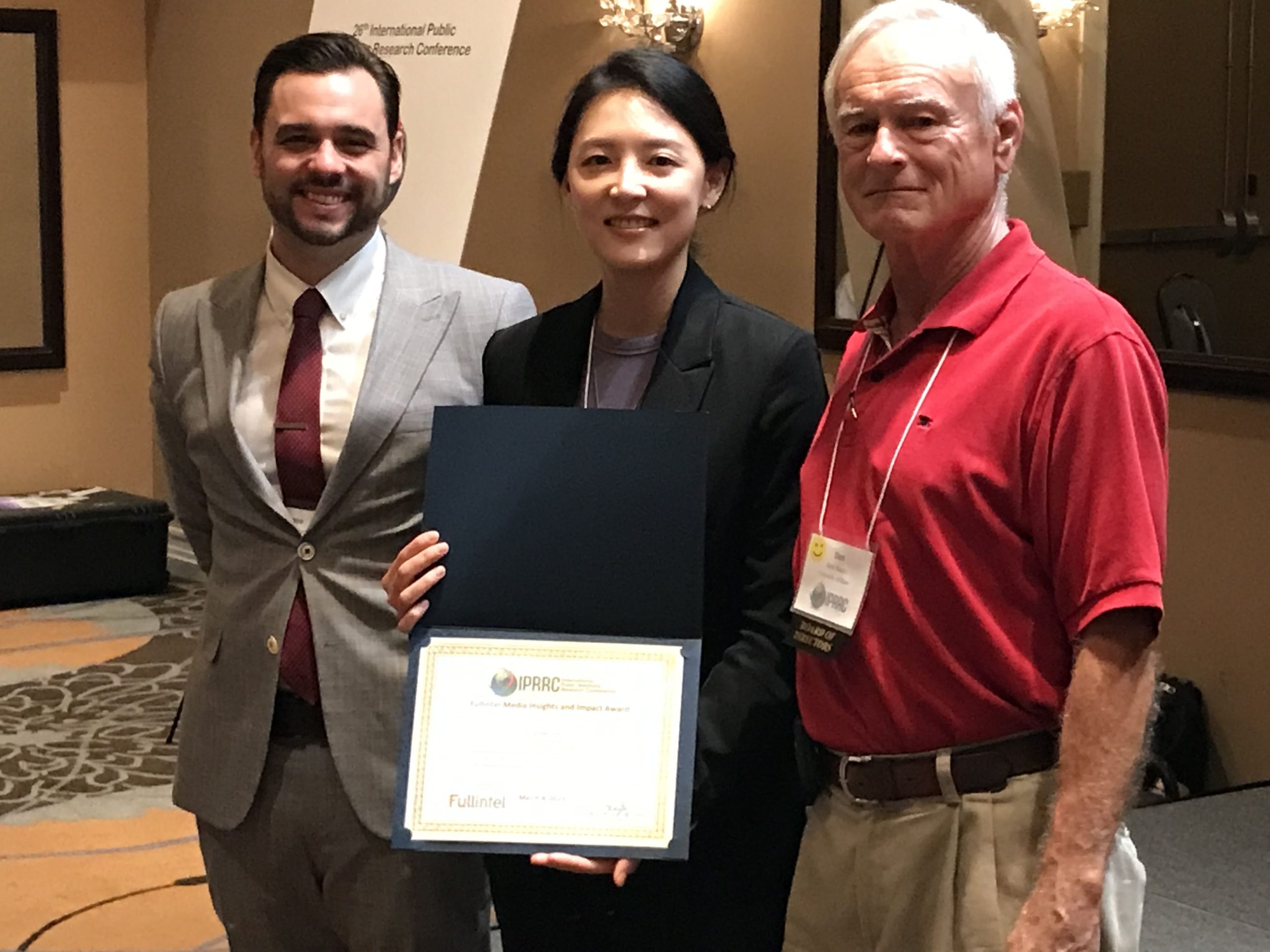 James Rubec, head of product, Fullintel and Don Stacks, Conference CEO for IPPRC present the Fullintel Media Insights and Impact Award to Ejae Lee of Indiana University for her paper Measuring Perceived Authenticity in Corporate Social Advocacy. Photo courtesy of IPRRC.