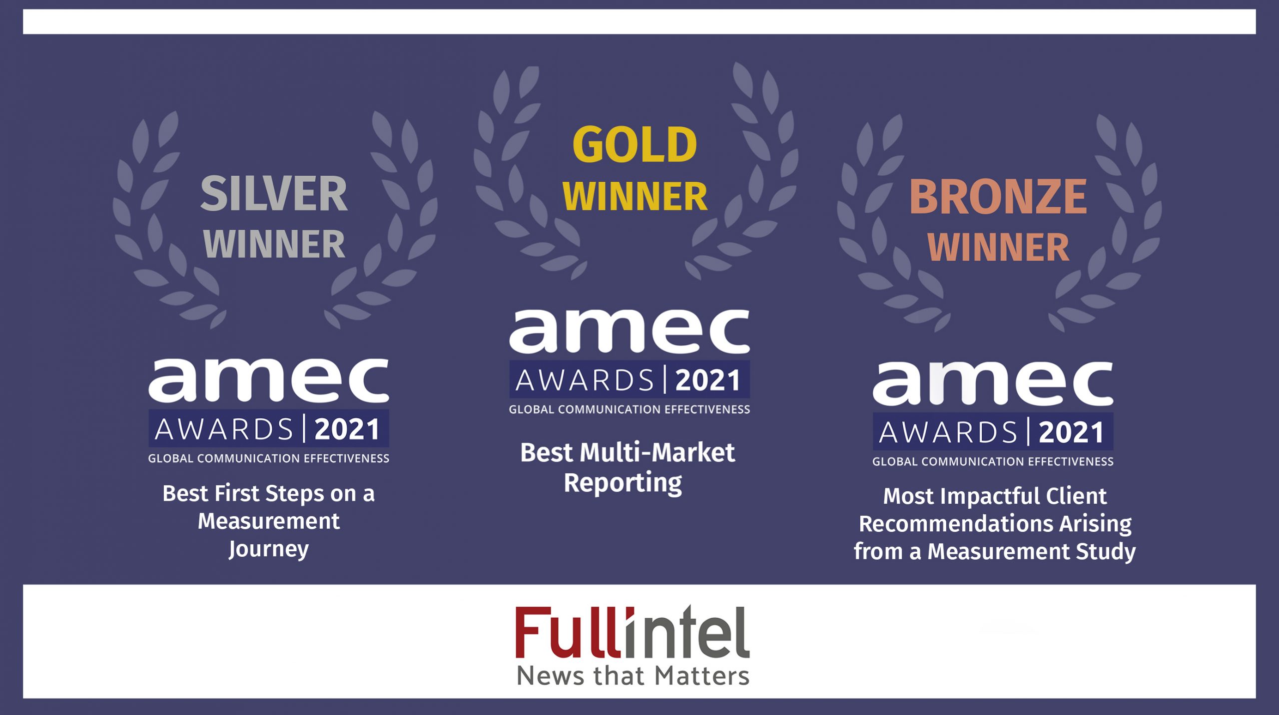 CAMBRIDGE, Mass. – December 06, 2021 – Fullintel, a global media monitoring and intelligence service providing industry-leading human curation and analysis, is pleased to announce it has won three 2021 AMEC Awards in the following categories: