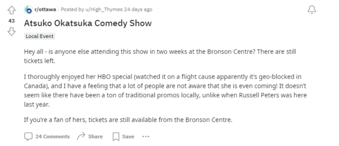 “My friends and I know her really well, and there were still a lot of tickets left with less than two weeks before the show,” said Nguyen, adding that Okatsuka’s show sold out nearly everywhere else in the world, but wasn’t aired in Canada due to licensing challenges. “The first thing I did was post on Reddit.”